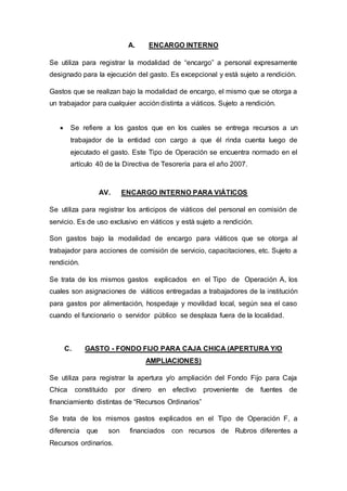 Este documento resume diferentes tipos de operaciones de gasto en el sector público peruano, incluyendo encargos internos, encargos para viáticos, gastos para caja chica, encargos otorgados a otras entidades y adquisición de bienes y servicios. Explica los procedimientos y normativas que rigen cada tipo de operación de acuerdo a la legislación presupuestal y de tesorería peruana.