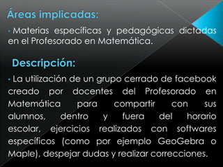 El documento propone la creación de un grupo cerrado de Facebook para que docentes del Profesorado en Matemática compartan ejercicios resueltos con softwares y respondan consultas de estudiantes dentro y fuera del horario escolar. Esto permitiría brindar apoyo extraescolar a los estudiantes, especialmente a los que viven fuera de la ciudad, e incentivar el uso de las TIC en la enseñanza entre docentes y estudiantes.