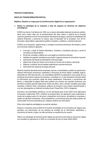 El documento describe los objetivos y planes de transformación digital del Banco Central de Honduras. El banco busca mejorar los procesos internos, consolidar datos e implementar reportes dinámicos y APIs en su sitio web para brindar nuevos servicios de datos en línea a clientes de forma automática y segura. El plan incluye identificar indicadores clave, obtener requisitos de clientes, pruebas y socialización de la nueva plataforma. El objetivo es mejorar la experiencia digital de clientes e incrementar la interacción digital en un 90% en los próximos