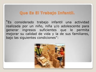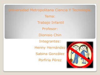 El documento trata sobre el trabajo infantil en Panamá. Explica que los niños indígenas en áreas rurales a menudo se ven obligados a trabajar debido a altos niveles de pobreza. Define las edades y horas que constituyen trabajo infantil y los criterios para determinar si es explotador. También discute los esfuerzos de UNICEF y otras organizaciones para erradicar el trabajo infantil, incluidos proyectos educativos y de protección social.