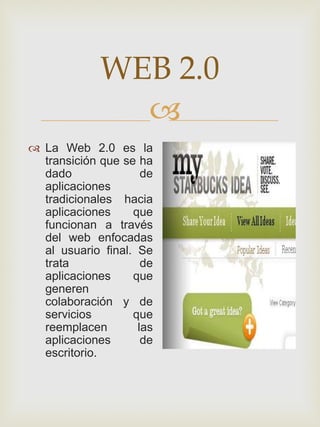 El documento resume diferentes herramientas y servicios web 2.0 como Flickr, blogs, SlideShare, correo electrónico, wikis, YouTube y Twitter. Explica brevemente qué es cada uno y para qué se usan, permitiendo compartir fotografías, videos, presentaciones y comunicarse e intercambiar información en línea de manera colaborativa.