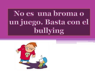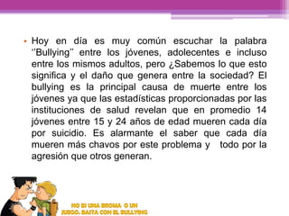 El documento habla sobre el bullying o acoso escolar, definiéndolo como el maltrato psicológico, verbal o físico que se produce de forma reiterada entre estudiantes. Explica que las víctimas suelen tener baja autoestima y ser aisladas, mientras que los agresores tienden a ser dominantes. También detalla los efectos negativos del bullying tanto en las víctimas como en los agresores, incluyendo problemas de depresión, ansiedad y en algunos casos, intentos de suicidio.