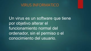 Este documento describe los principales riesgos de la información electrónica como los virus informáticos, ataques cibernéticos y métodos de protección. Explica que un virus es un software malicioso que altera el funcionamiento de una computadora sin el permiso del usuario, y que se propaga al replicar su código en otros programas. También detalla diferentes tipos de ataques como malware, phishing, man-in-the-middle, y suplantación de identidad. Finalmente, resalta la importancia de utilizar antivirus y filtros de archivos para prote