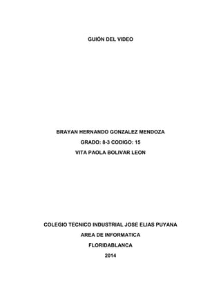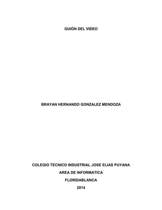 Este documento presenta el guión de un video sobre el deber de los estudiantes de cuidar la planta física de su colegio. El guión incluye una introducción del tema, objetivos, entrevistas con un padre de familia y un estudiante sobre la importancia de cuidar las instalaciones, y tomas de video de los espacios del colegio. Finalmente, contiene una sección de reflexión donde se discuten posibles soluciones para mejorar el cuidado de la planta física a través de la educación de los estudiantes y padres.