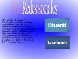 Las redes sociales son sitios web que ofrecen diversas funciones de comunicación para mantener a los usuarios conectados, como blogs, wikis, chats y mensajería. Se basan en software que integra estas funciones en una interfaz y conecta a los usuarios de la red, como Facebook, Twitter y Tuenti.
