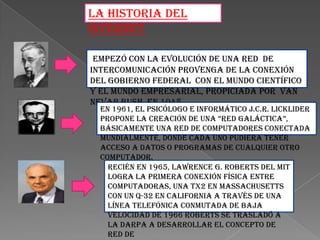 La historia del Internet comenzó en 1945 con la conexión entre el gobierno de EE.UU. y el mundo académico y empresarial. En 1961 se propuso la creación de una "red galáctica" de computadoras conectadas mundialmente, y en 1965 se logró la primera conexión entre dos computadoras a través de una línea telefónica. Tim Berners-Lee creó la World Wide Web en 1989 para permitir la interacción entre usuarios de Internet. En la década de 1990 se desarrollaron los navegadores modernos y Netscape populariz