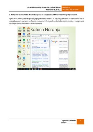 Este documento contiene 20 actividades relacionadas con el uso de Internet que un estudiante de la Universidad Nacional de Chimborazo realizó como parte de un curso de Informática TIC. Las actividades incluyen búsquedas en Google, el uso de redes sociales como Facebook y correo electrónico, y navegación en páginas web de interés como radios en línea y carteleras de cine. El documento proporciona instrucciones detalladas sobre cómo completar cada actividad relacionada con el uso de herramientas y servicios de Internet.