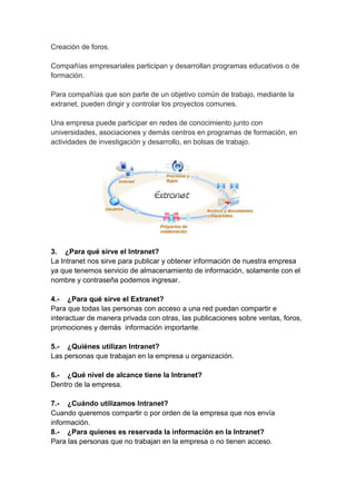 Una intranet es una red privada interna de una organización que permite compartir información entre empleados utilizando estándares de Internet. Una extranet extiende parte de la intranet a usuarios externos como proveedores o clientes para compartir información de forma segura. Ambas redes permiten publicar y obtener información de la organización, pero la intranet se limita a empleados mientras que la extranet también incluye socios externos.