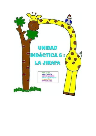 Este documento presenta una unidad didáctica sobre las jirafas. Incluye 9 actividades con objetivos, materiales y descripciones para enseñar a los niños sobre las jirafas y animales de su entorno. También incluye anexos con materiales para las actividades como cuentos, dibujos e imágenes. El objetivo principal es que los niños conozcan a la jirafa en todos sus aspectos.