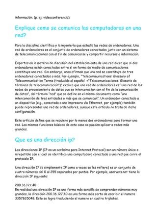 Una red de computadoras es una interconexión de computadoras para compartir información, recursos y servicios a través de enlaces físicos o inalámbricos. Las computadoras se comunican en una red utilizando protocolos de red. Existen diferentes tipos de redes clasificadas por su alcance, método de conexión, relación funcional, topología y direccionalidad de los datos.