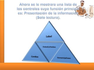 Este documento resume los objetivos y características de los controles de Visual Basic.NET 2012. Explica que Visual Basic es un lenguaje de programación orientado a objetos que permite generar aplicaciones seguras. Describe brevemente los controles Textbox, RichTextbox, MaskedTextbox, Label, CheckedListBox, ComboBox y ListView, explicando sus funciones principales para la edición y presentación de texto.