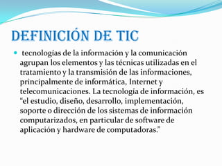 Este documento define las tecnologías de la información y la comunicación (TIC) como los elementos y técnicas utilizadas para procesar y transmitir información, principalmente informática, Internet y telecomunicaciones. Explica que las TIC afectan la forma de vida de las sociedades y deben usarse para mejorar la educación sin caer en un optimismo exagerado sobre sus beneficios. Finalmente, identifica algunas ventajas y desventajas del uso de las TIC, como la motivación que generan pero también la posible distracción.