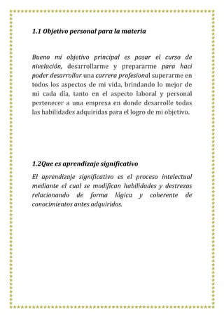 Este documento presenta los objetivos de aprendizaje de dos estudiantes y describe conceptos clave sobre el aprendizaje significativo, incluyendo sus características y tipos. También detalla técnicas para mejorar el estudio como la lectura exploratoria, subrayado, esquemas, resúmenes y memorización. Además, discute factores que afectan el aprendizaje como el ambiente de estudio y el aporte de las tecnologías de la información a la educación.
