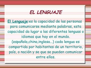 El documento resume los conceptos básicos de lenguaje y lengua. Explica que el lenguaje es la capacidad humana para comunicarse y que cada lengua es compartida por los habitantes de un territorio. Describe que la lengua es el código verbal oral y escrito usado por una comunidad, e identifica algunas lenguas europeas. Explica que la lengua se compone de fonemas, palabras y oraciones, y que el español tiene 24 fonemas. Finalmente, define conceptos como fonemas, sílabas y palabras.