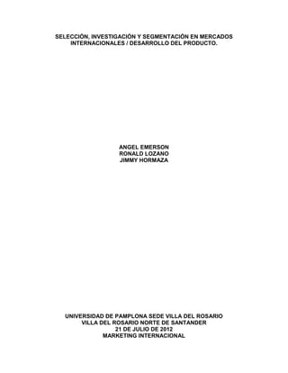 Este documento resume los conceptos clave de la selección, investigación y segmentación de mercados internacionales y el desarrollo de productos para dichos mercados. Explica que una empresa debe investigar y seleccionar cuidadosamente los mercados meta, analizando factores como el entorno económico, político, social y cultural. También cubre temas como la segmentación de mercados internacionales, las estrategias de entrada a nuevos mercados y las formas de exportación a considerar. El objetivo final es que la empresa pueda desarrollar e implementar una estrateg