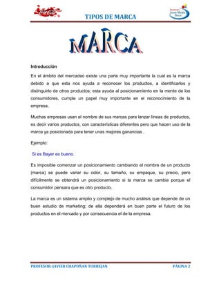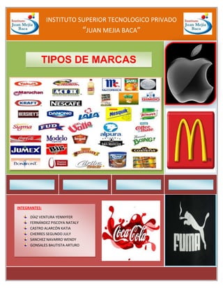 Este documento describe los diferentes tipos de marcas, incluyendo marcas nominativas, figurativas, mixtas y tridimensionales. Explica que las marcas nominativas identifican productos mediante palabras, letras o números, mientras que las marcas figurativas usan símbolos, logotipos u otros elementos visuales. También cubre las marcas mixtas, que combinan elementos nominativos y figurativos, y las marcas tridimensionales basadas en la forma de los productos.