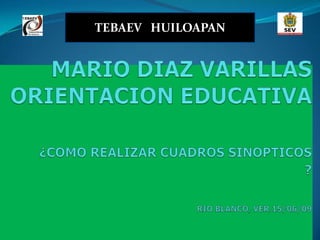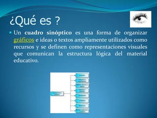 Un cuadro sinóptico es una herramienta visual que organiza y representa las ideas principales y relaciones de un texto de manera esquemática. Para elaborar un cuadro sinóptico, se deben identificar los conceptos centrales y puntos principales del texto y representarlos de forma ordenada, indicando sus relaciones. Un cuadro sinóptico provee una estructura coherente que facilita la comprensión del material al visualizar y relacionar sus ideas clave.