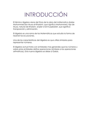 Este documento explica conceptos básicos de álgebra como términos algebraicos, expresiones algebraicas, polinomios y ecuaciones algebraicas. Define álgebra como el estudio de cómo resolver ecuaciones y explica que utiliza símbolos para representar números. También cubre temas como coeficientes, variables, exponentes, sumas, restas, multiplicaciones y divisiones algebraicas.