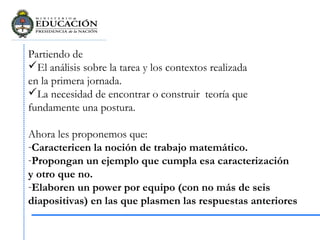 El documento propone que los equipos caractericen la noción de trabajo matemático, propongan un ejemplo que cumpla con esa caracterización y otro que no, y elaboren un power de hasta seis diapositivas con sus respuestas. Se pide esto basado en un análisis previo de la tarea y los contextos realizados en una jornada anterior, y la necesidad de encontrar o construir teoría que fundamente una postura sobre el trabajo matemático.