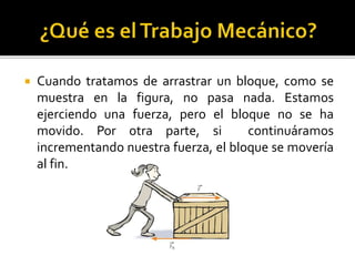 El documento define trabajo como el producto de la fuerza aplicada y la distancia de desplazamiento a lo largo de la cual actúa la fuerza. Explica que para que haya trabajo, se requiere una fuerza aplicada que actúe a lo largo de una distancia, y que la fuerza tenga una componente paralela al desplazamiento. También proporciona ejemplos de cálculos de trabajo realizado al levantar objetos a ciertas alturas o subirlos por escaleras.