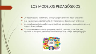 El documento resume cinco modelos pedagógicos: tradicional, activista, conceptual, marxista y constructivista. Describe los objetivos, contenidos, metodologías, recursos y evaluaciones características de cada modelo. El modelo tradicional se centra en la memorización y la autoridad del maestro. El modelo activista enfatiza la experiencia directa y la libertad del estudiante. El modelo conceptual se enfoca en el desarrollo de conceptos. El modelo marxista busca la liberación a través del cambio social. Y el modelo constructivista ve el apre