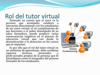El documento describe las funciones y competencias clave de un tutor virtual. Un tutor virtual debe motivar a los estudiantes, enseñarles a aprender de forma autónoma y usar efectivamente las herramientas tecnológicas. Un buen tutor tiene competencias comunicativas, organizativas y tecnológicas. También debe diseñar estrategias antes, durante y después del curso para guiar a los estudiantes y asegurar su éxito.