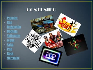 Este documento resume varios géneros musicales populares como el rap, reggaetón, bachata, vallenatos, regué, salsa, pop, rock y merengue. Describe brevemente el origen y características de cada género.