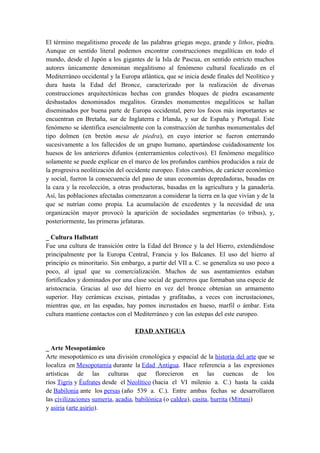 El documento resume las principales manifestaciones artísticas de la prehistoria y la antigüedad, incluyendo el arte franco-cantábrico, el arte rupestre levantino, el megalitismo, el arte mesopotámico, el arte egipcio, el arte cretense, el arte persa y el arte fenicio. Describe las características de cada uno de estos estilos artísticos, como las técnicas, temas, convencionalismos y evolución a lo largo del tiempo.