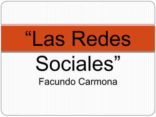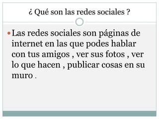 Las redes sociales son páginas web donde las personas pueden comunicarse con amigos, ver fotos y actividades. Las tres redes más conocidas son Facebook, que permite conectarse con amigos y ver sus publicaciones, MySpace, y Twitter, que se enfoca en actualizaciones breves. Si bien las redes sociales son populares entre los jóvenes para mantenerse en contacto, también plantean riesgos como dar información personal o encontrarse con desconocidos, por lo que se deben tomar precauciones como no publicar fotos personales o agregar personas no conocidas.