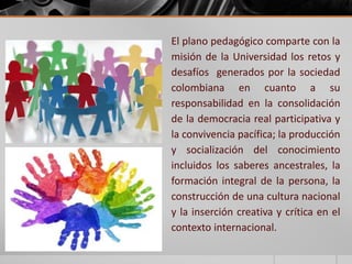 El documento describe el componente pedagógico-didáctico de la UNAD, el cual se basa en ocho ejes transversales y busca la formación integral de la persona a través de la educación abierta y a distancia. Explica el modelo pedagógico apoyado por e-learning de la universidad, el cual incluye ambientes virtuales de aprendizaje, tutoría y evaluación continua para apoyar el aprendizaje autónomo de los estudiantes.