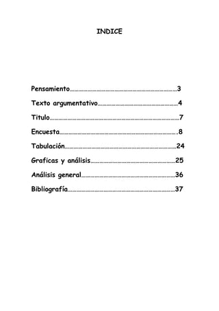Este documento presenta los resultados de una encuesta sobre el desarrollo infantil aplicada a estudiantes de segundo grado. La encuesta abordó temas como la actitud de los padres, el cuidado cuando están enfermos, el tiempo que pasan con la familia, la alimentación y el apoyo ante malos resultados escolares. Los resultados mostraron que la mayoría de los padres se enojan de forma furiosa, las madres son quienes más cuidan a los niños enfermos, pasan poco tiempo con la familia y su alimentación es principalmente sana.