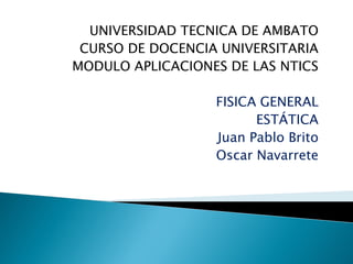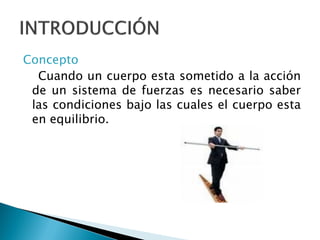 Este documento trata sobre la estática y las fuerzas. Explica que un cuerpo está en equilibrio cuando está en reposo o en movimiento rectilíneo uniforme. Define conceptos como fuerza, masa y gravedad. Describe que el equilibrio se produce cuando la fuerza resultante es cero y que el equilibrio rotacional ocurre cuando la suma de los momentos de todas las fuerzas es cero.