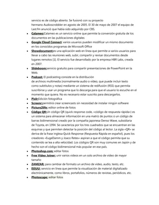 Este documento describe una variedad de herramientas digitales gratuitas para editar audio, video, imágenes y documentos; crear presentaciones, libros digitales y líneas de tiempo; y compartir archivos y contenido en línea, incluyendo Prezi, Audacity, Photopeach, Tubechop, Pinterest, Myebook, Goear, Dropbox, Google Body, Force-download.es, Dipity y más.