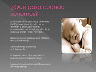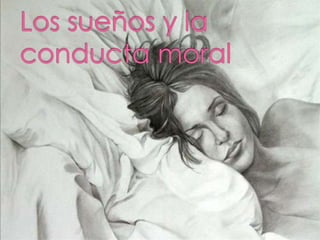 El documento trata sobre los sueños y la conducta moral. Explica que los sueños cumplen una función fisiológica al eliminar toxinas y relajar los músculos durante el sueño. También explora temas como la naturaleza de los sueños, por qué recordamos algunos y otros no, el papel de la hipnosis y si los animales y las personas ciegas pueden soñar.