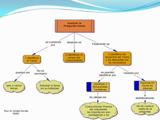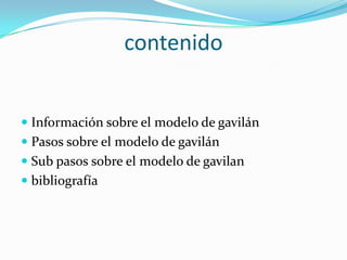 Este documento presenta el modelo de gavilán para la solución de problemas de información. Explica los cuatro pasos principales del modelo: 1) definir el problema e indagar, 2) buscar y evaluar fuentes, 3) analizar la información, y 4) sintetizar e información y utilizarla. Cada paso incluye subpasos más específicos para guiar el proceso de investigación. El documento proporciona este marco metodológico para proyectos educativos.
