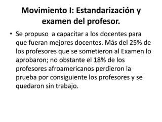 El documento discute dos movimientos para reformar la educación pública en Texas en respuesta al agotamiento de los maestros: 1) La estandarización y exámenes para maestros, que resultó en el despido de muchos maestros, especialmente afroamericanos; 2) La descentralización y gestión a nivel de escuela, asumiendo que se necesitaba una reestructuración total del sistema descentralizado.