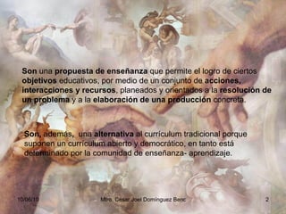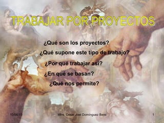 El documento describe el método de trabajo por proyectos en la educación. Este método permite lograr objetivos educativos a través de acciones planeadas para resolver un problema o crear una producción. Rompe con el currículo tradicional por asignaturas y en su lugar fomenta un aprendizaje basado en la experiencia. El proceso de un proyecto implica etapas de origen, desarrollo y evaluación que involucran a estudiantes, maestros y familias.