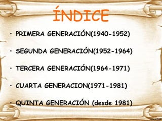 El documento resume las cinco generaciones de la historia de la informática desde la primera generación en los años 1940 hasta la quinta generación a partir de 1981. La primera generación incluyó las primeras computadoras programables y ENIAC. La segunda generación reemplazó las válvulas de vacío con transistores. La tercera generación introdujo los circuitos integrados. La cuarta generación desarrolló el microprocesador y los ordenadores personales. Y la quinta generación se enfocó en la inteligencia artificial.