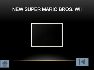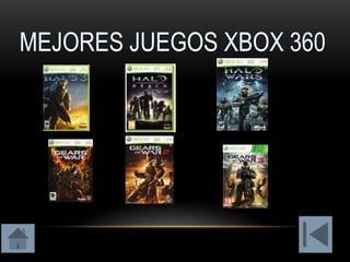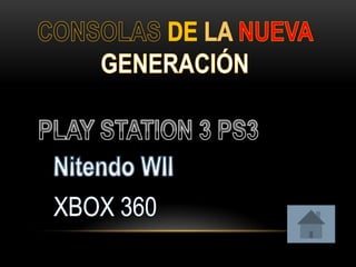 El documento proporciona información sobre varias consolas de videojuegos populares como la PlayStation 3, Nintendo Wii, Xbox 360, asi como algunos de sus juegos destacados. Describe brevemente cada consola, sus características clave y algunos de sus juegos más populares como God of War, New Super Mario Bros y Gears of War 3.