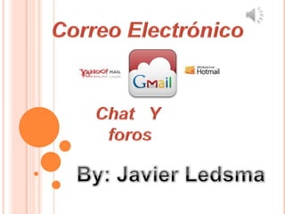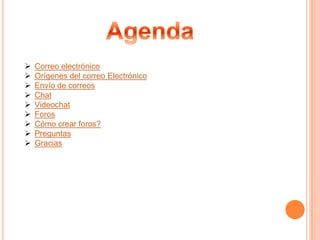 El documento habla sobre varios temas relacionados con la comunicación en línea. Explica brevemente el origen y funcionamiento del correo electrónico, así como otros métodos como el chat, videochat y los foros. Define cada uno de estos métodos y da algunos detalles sobre cómo se pueden crear foros en Internet utilizando diferentes plataformas y sistemas de gestión de contenidos.