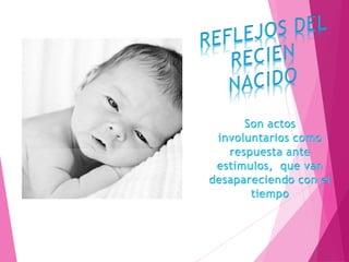 El documento describe los subsistemas del sistema nervioso autónomo de un recién nacido, incluyendo el sistema motor, los estados de conciencia, y el sistema de atención-interacción. También describe varios reflejos primarios o arcaicos de un recién nacido, como el reflejo de succión, búsqueda, nasopalpebral, apoyo y marcha, prensión palmar y plantar, Moro, Babinski, cervical y a la luz.