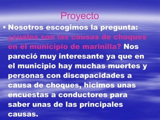 El documento resume un proyecto escolar sobre las causas de los choques en el municipio de Marinilla, Colombia. Los estudiantes realizaron encuestas a conductores que indicaron que los principales factores son el exceso de velocidad, conducir bajo la influencia del alcohol, y la imprudencia al no respetar las normas de tránsito. El objetivo del proyecto era dar a conocer las causas de los choques e intentar evitar más accidentes.