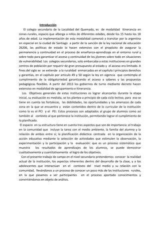 Este documento presenta un resumen de 3 oraciones del trabajo de campo realizado en el Colegio Secundario de la Localidad del Quemado en Santiago del Estero, Argentina. El colegio funciona en modalidad de itinerancia para garantizar la educación secundaria en zonas rurales. El resumen describe la institución, el contexto de los estudiantes y las actividades planificadas como parte de la práctica docente de las autoras del documento.