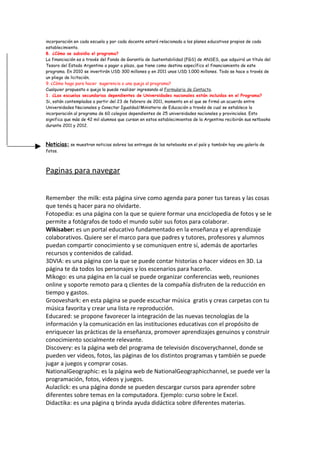 El documento describe el sitio web Educ.ar, el cual ofrece noticias y capacitación sobre educación en Argentina. También proporciona más de 1500 recursos educativos para ser usados en el aula. Además, resume el Programa Conectar Igualdad, el cual busca reducir brechas digitales, educativas y sociales a través de la distribución de 3 millones de netbooks a estudiantes y docentes de escuelas públicas entre 2010-2012. Finalmente, recomienda varias páginas web relacionadas con educación, fotografía
