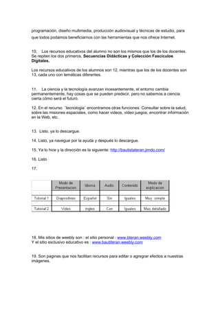 El documento describe los recursos educativos disponibles a través del Programa Conectar Igualdad, incluyendo secuencias didácticas, fascículos digitales, biblioteca, cursos, programas educativos, videos y más. Los recursos permiten a los estudiantes y docentes acceder a materiales de diferentes materias, así como desarrollar competencias en TIC a través de temas como programación, diseño web, producción audiovisual y técnicas de estudio. Los recursos educativos de los estudiantes y docentes no son exactamente los mismos y cada