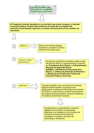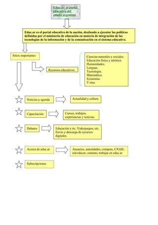 Educ.ar es el portal educativo del estado argentino que ejecuta las políticas del ministerio de educación para integrar las tecnologías de la información y comunicación en el sistema educativo. El portal contiene recursos educativos en diversas áreas como ciencias, educación física, humanidades y lenguas, así como noticias y eventos del sector educativo. También ofrece capacitación docente y debates sobre temas educativos.