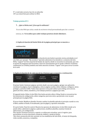 El documento proporciona instrucciones para completar un trabajo práctico que incluye visitar varios sitios web educativos, crear cuentas de correo y sitios web personales, y describir los pasos para descargar archivos y publicar documentos en línea. El resumen describe los pasos para crear una página personal en Webs.com e incluye instrucciones para crear una cuenta, seleccionar un estilo de galería, agregar contenido personal y verificar el correo electrónico para finalizar la configuración de la página.