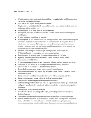 Este documento lista varias páginas web y sus usos, incluyendo páginas para crear wordles, publicar revistas, hacer portadas con imágenes y videos, subir fotos y artículos, grabar la pantalla, crear fotoblogs, hacer collages e investigaciones, responder preguntas, cortar videos de YouTube, crear revistas y comics, editar fotos, hacer presentaciones, compartir música, alojar archivos, ver un mapa del cuerpo humano, bajar y convertir videos, crear líneas de tiempo, buscar videos de artistas,