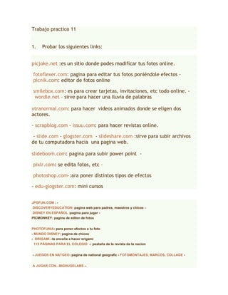 Este documento lista recursos educativos en línea como editores de fotos, creadores de presentaciones y tarjetas, sitios para hacer videos animados, y páginas web para jugar y aprender sobre temas como origami, Disney y National Geographic. Se proporcionan enlaces a más de 20 herramientas y sitios web educativos.