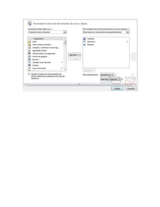 Este documento proporciona instrucciones sobre las funciones básicas de Microsoft Word. Explica las diferentes barras y herramientas en la interfaz de Word como la barra de herramientas de acceso rápido, la barra de título, la cinta de opciones y la barra de estado. También cubre cómo guardar, abrir y cerrar documentos, seleccionar texto, mover el cursor, reemplazar palabras y ver múltiples documentos a la vez.